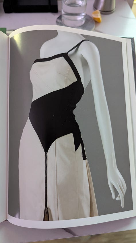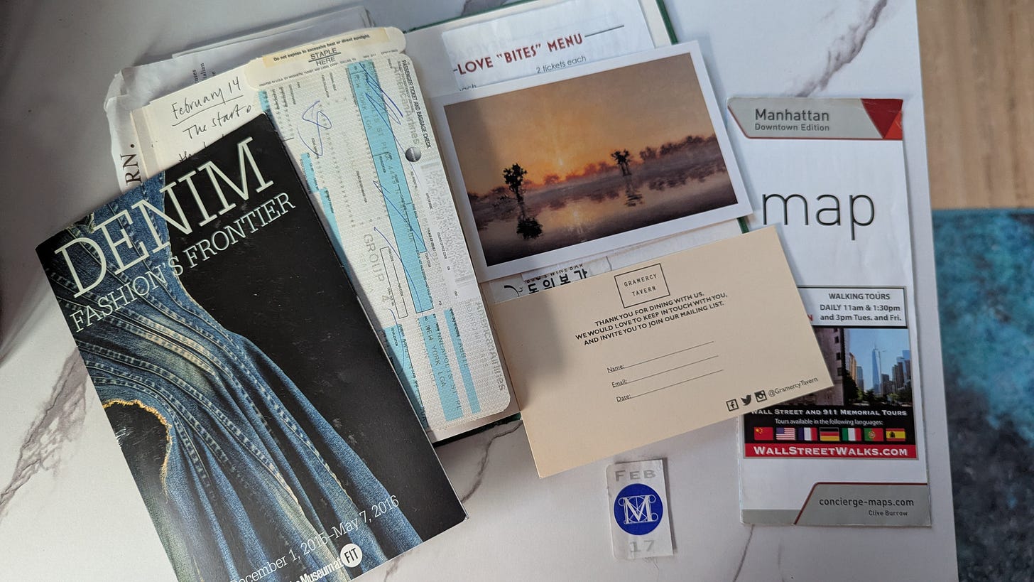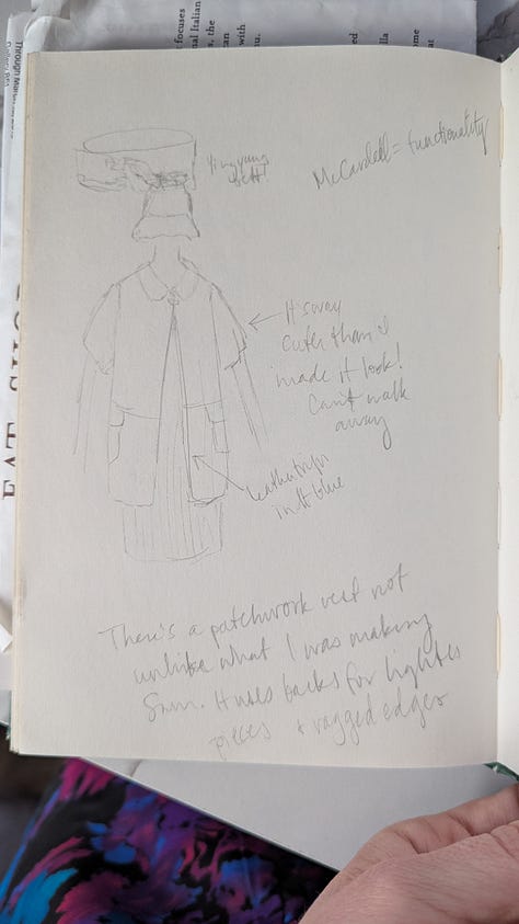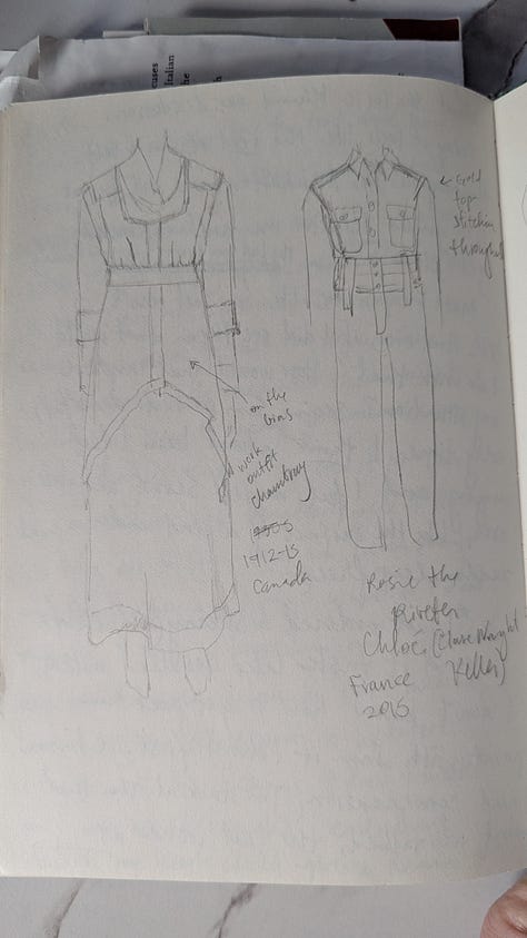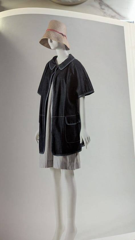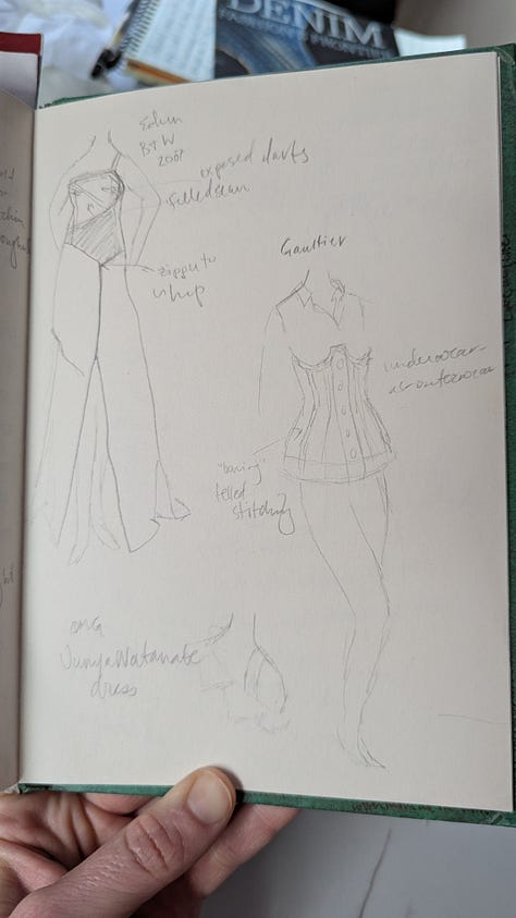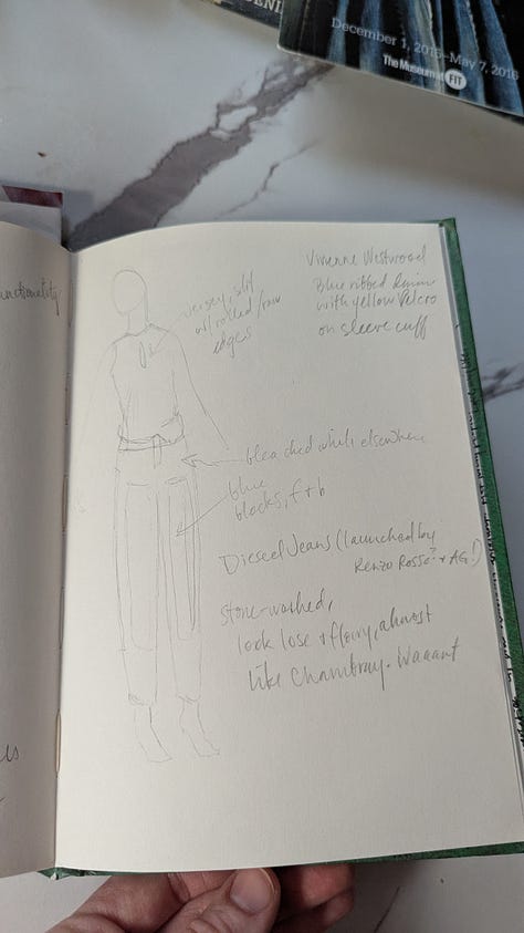 Another appealing detail about this book is how it transported me back to a collection of fond memories. In 2016, I was in New York City and actually saw this exhibit in person. It wasn’t the reason I went to NYC, but the FIT museum—free to the public—is one place I make a point to visit whenever I’m in town. Finding this Denim book at the library sent me searching for the journal I brought on that trip and the details I knew were written down somewhere. I recall sketching the denim pieces that, at the time, stood out to me as I marveled at the whole collection and the sheer versatility of denim. I always prefer a sketchbook to a camera at any fashion exhibit for the extra time and attention it invites you to spend. On this particular day at the museum, I had nothing to do and nothing but time, and it was raining violently outside; why not spend an afternoon soaking it all in?